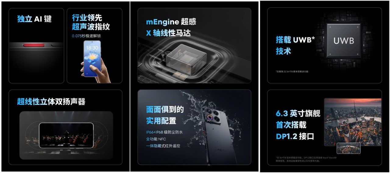 其他:对称双扬声器,双频GPS四频北斗定位,红外遥控,超声波指纹,X轴线性马达,USB2.0接口,IP68,UWB钥匙;